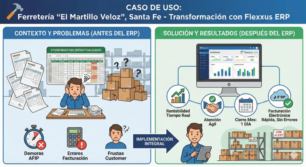 Contexto: Una ferretería mediana, con 20 años en el mercado. Tenían un sistema básico de facturación, el stock se controlaba con un Excel «maestro» que rara vez coincidía con la realidad física del depósito, y las compras se hacían «a ojo». La contadora externa recibía resúmenes de venta y cajas casi al cierre del período fiscal, lo que dificultaba las presentaciones de AFIP y la detección temprana de desvíos.
