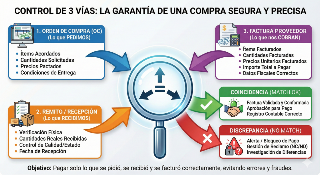 Este proceso de «matching» a 3 vías (OC – Remito – Factura) es fundamental para: